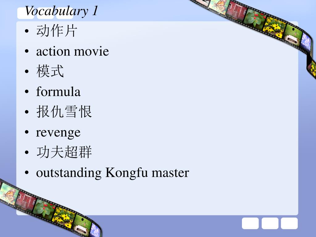 Vocabulary 1 • 动作片 • action movie • 模式 • formula • 报仇雪恨 • revenge • 功夫超群 • outstanding Kongfu master