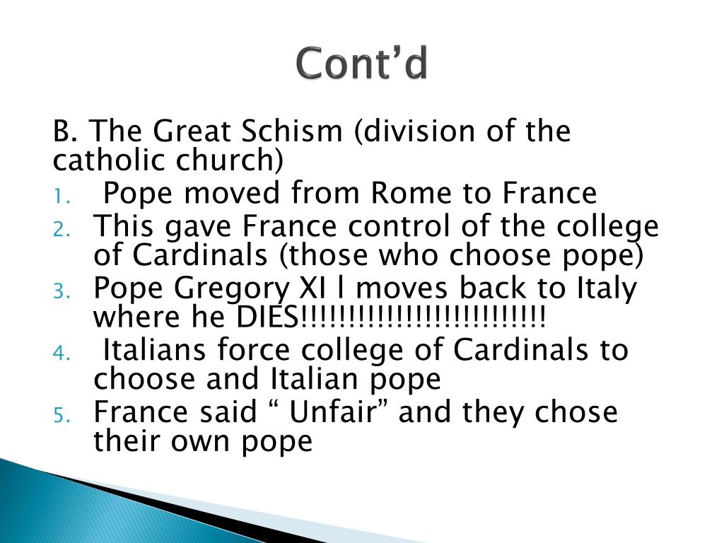 Cont’d B. The Great Schism (division of the catholic church) • Pope moved from Rome to France • This gave France control of the college of Cardinals (those who choose pope) • Pope Gregory XI l moves back to Italy where heDIES!!!!!!!!!!!!!!!!!!!!!!!!!! • Italians force college of Cardinals to choose and Italian pope • France said “ Unfair” and they chose their own pope