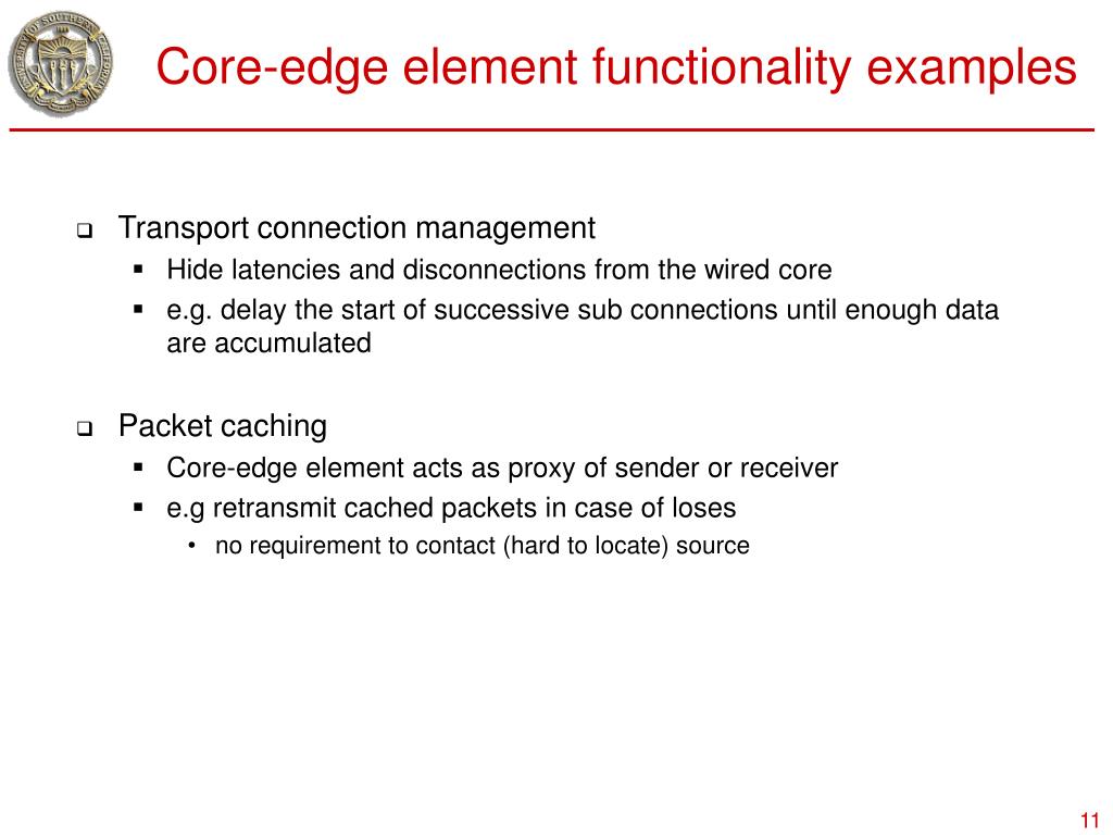 Core-edge element functionality examples • Transport connection management • Hide latencies and disconnections from the wired core • e.g. delay the start of successive sub connections until enough data are accumulated • Packet caching • Core-edge element acts as proxy of sender or receiver • e.g retransmit cached packets in case of loses • no requirement to contact (hard to locate) source