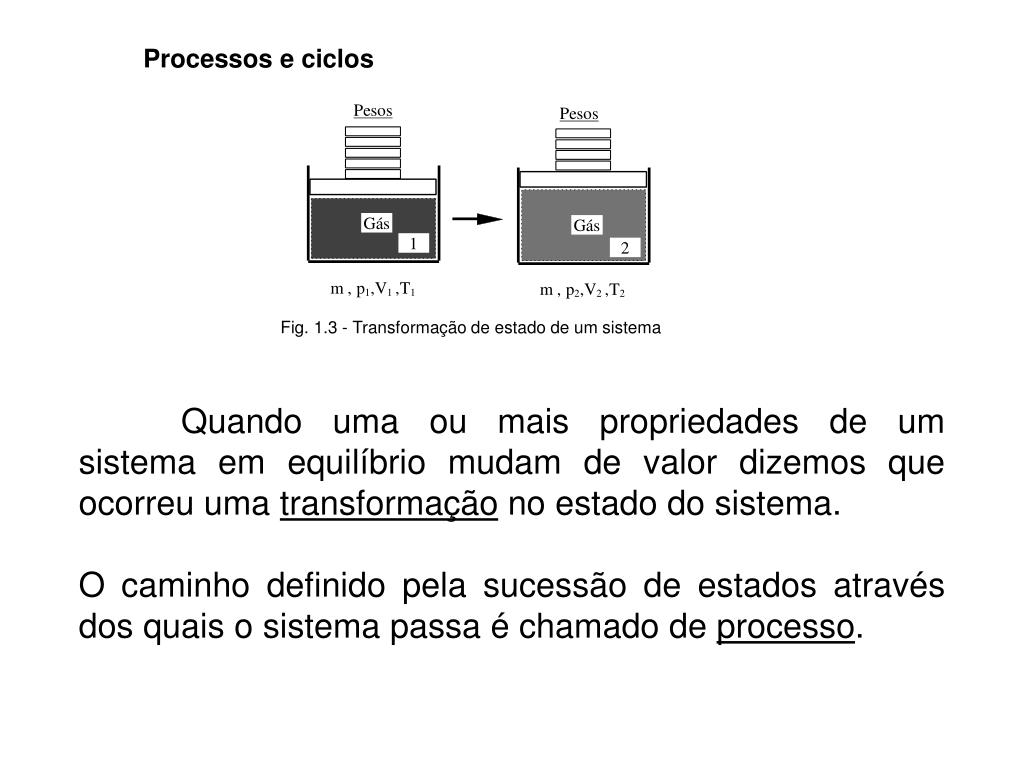 Processos e ciclos Quando uma ou mais propriedades de um sistema em equilíbrio mudam de valor dizemos que ocorreu uma transformação no estado do sistema. O caminho definido pela sucessão de estados através dos quais o sistema passa é chamado de processo.