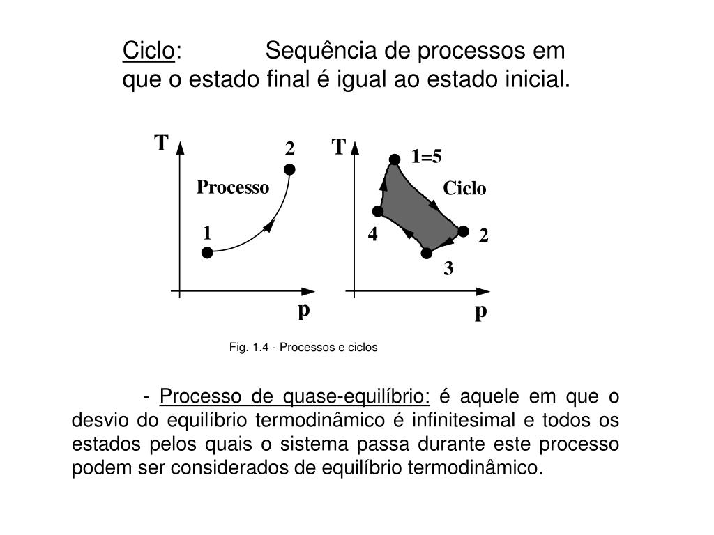 Ciclo: Sequência de processos em que o estado final é igual ao estado inicial. - Processo de quase-equilíbrio: é aquele em que o desvio do equilíbrio termodinâmico é infinitesimal e todos os estados pelos quais o sistema passa durante este processo podem ser considerados de equilíbrio termodinâmico.