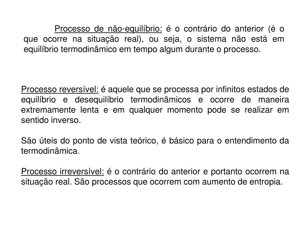 Processo de não-equilíbrio: é o contrário do anterior (é o que ocorre na situação real), ou seja, o sistema não está em equilíbrio termodinâmico em tempo algum durante o processo. Processo reversível: é aquele que se processa por infinitos estados de equilíbrio e desequilíbrio termodinâmicos e ocorre de maneira extremamente lenta e em qualquer momento pode se realizar em sentido inverso. São úteis do ponto de vista teórico, é básico para o entendimento da termodinâmica. Processo irreversível: é o contrário do anterior e portanto ocorrem na situação real. São processos que ocorrem com aumento de entropia.