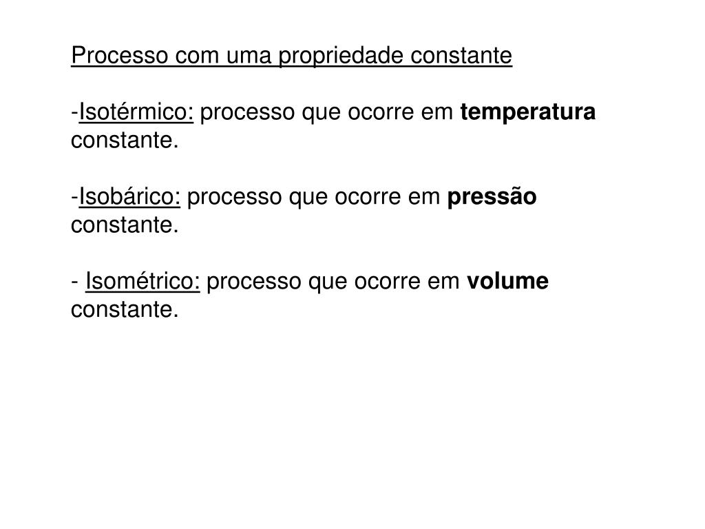 Processo com uma propriedade constante • Isotérmico: processo que ocorre em temperatura constante. • Isobárico: processo que ocorre em pressão constante. • - Isométrico: processo que ocorre em volume constante.
