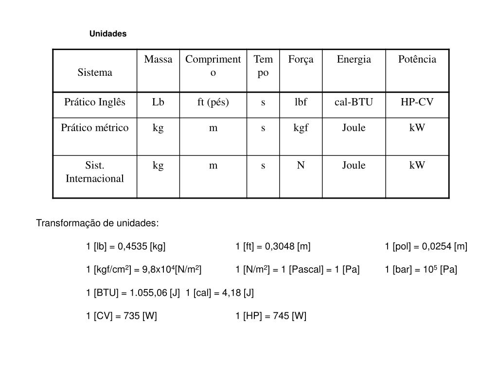 Unidades Transformação de unidades: 1 [lb] = 0,4535 [kg] 1 [ft] = 0,3048 [m] 1 [pol] = 0,0254 [m] 1 [kgf/cm2] = 9,8x104[N/m2] 1 [N/m2] = 1 [Pascal] = 1 [Pa] 1 [bar] = 105 [Pa] 1 [BTU] = 1.055,06 [J] 1 [cal] = 4,18 [J] 1 [CV] = 735 [W] 1 [HP] = 745 [W]