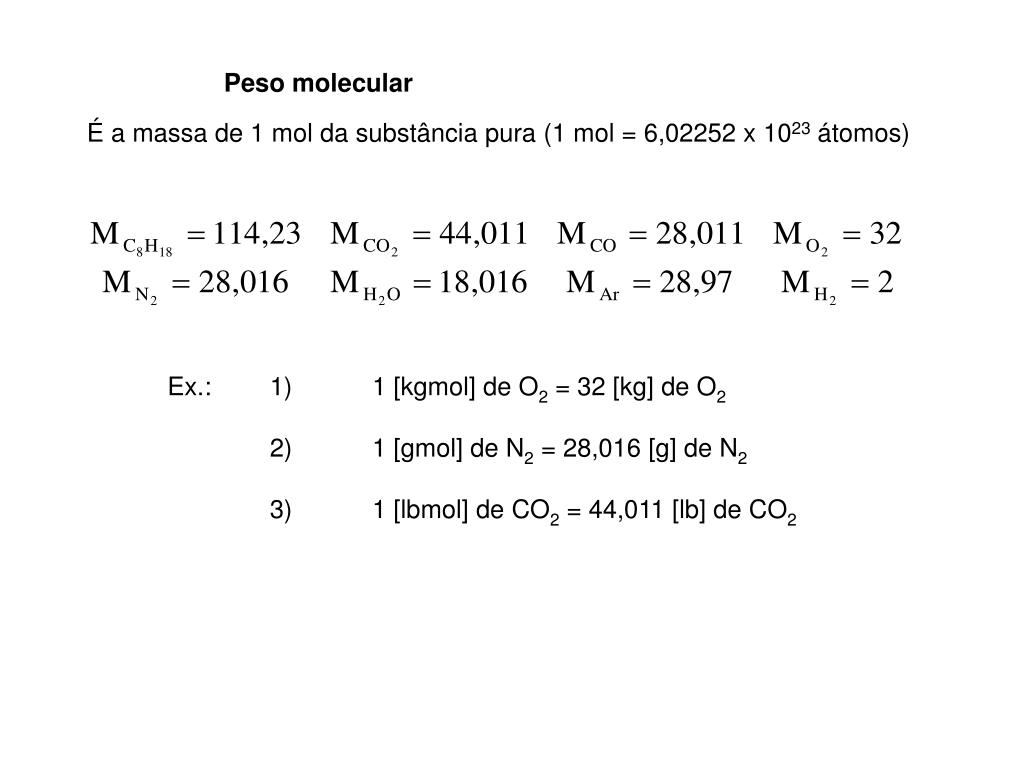 Peso molecular É a massa de 1 mol da substância pura (1 mol = 6,02252 x 1023 átomos) Ex.: 1) 1 [kgmol] de O2 = 32 [kg] de O2 2) 1 [gmol] de N2 = 28,016 [g] de N2 3) 1 [lbmol] de CO2 = 44,011 [lb] de CO2