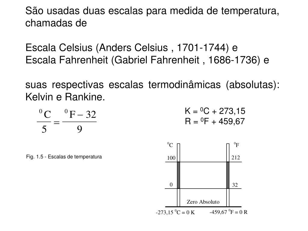 São usadas duas escalas para medida de temperatura, chamadas de Escala Celsius (Anders Celsius , 1701-1744) e Escala Fahrenheit (Gabriel Fahrenheit , 1686-1736) e suas respectivas escalas termodinâmicas (absolutas): Kelvin e Rankine. K = 0C + 273,15 R = 0F + 459,67