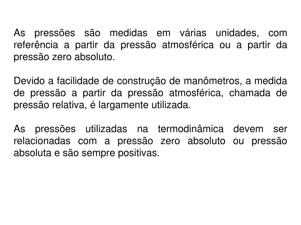As pressões são medidas em várias unidades, com referência a partir da pressão atmosférica ou a partir da pressão zero absoluto. Devido a facilidade de construção de manômetros, a medida de pressão a partir da pressão atmosférica, chamada de pressão relativa, é largamente utilizada. As pressões utilizadas na termodinâmica devem ser relacionadas com a pressão zero absoluto ou pressão absoluta e são sempre positivas.