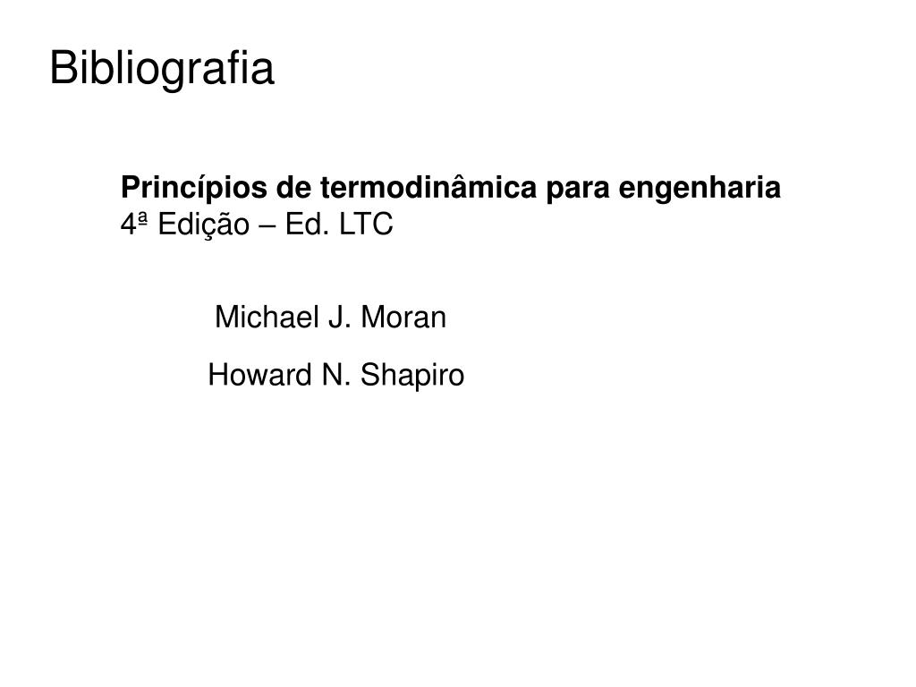 Bibliografia Princípios de termodinâmica para engenharia 4ª Edição – Ed. LTC Michael J. Moran Howard N. Shapiro