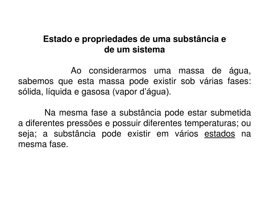 Estado e propriedades de uma substância e de um sistema Ao considerarmos uma massa de água, sabemos que esta massa pode existir sob várias fases: sólida, líquida e gasosa (vapor d’água). Na mesma fase a substância pode estar submetida a diferentes pressões e possuir diferentes temperaturas; ou seja; a substância pode existir em vários estados na mesma fase.