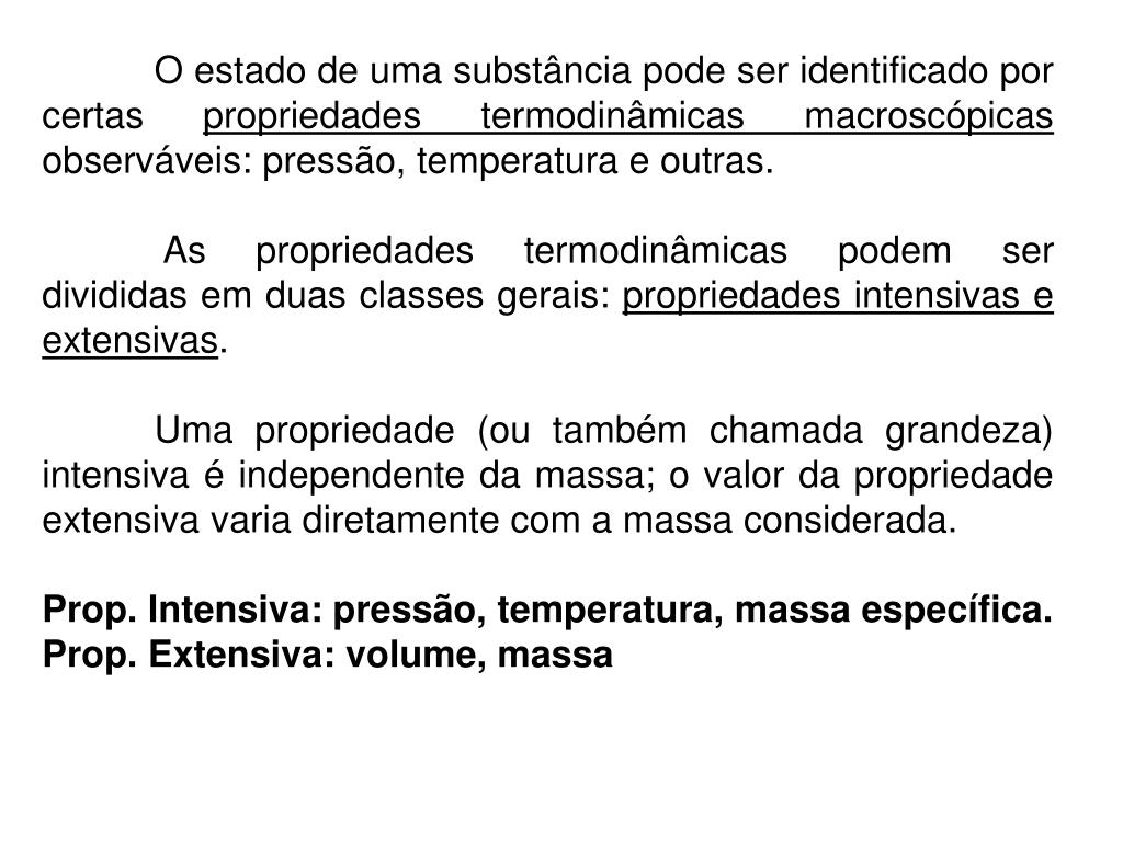 O estado de uma substância pode ser identificado por certas propriedades termodinâmicas macroscópicas observáveis: pressão, temperatura e outras. As propriedades termodinâmicas podem ser divididas em duas classes gerais: propriedades intensivas e extensivas. Uma propriedade (ou também chamada grandeza) intensiva é independente da massa; o valor da propriedade extensiva varia diretamente com a massa considerada. Prop. Intensiva: pressão, temperatura, massa específica. Prop. Extensiva: volume, massa