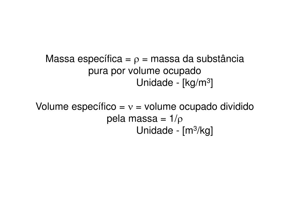 Massa específica = = massa da substância pura por volume ocupado Unidade - [kg/m3] Volume específico = = volume ocupado dividido pela massa = 1/ Unidade - [m3/kg]