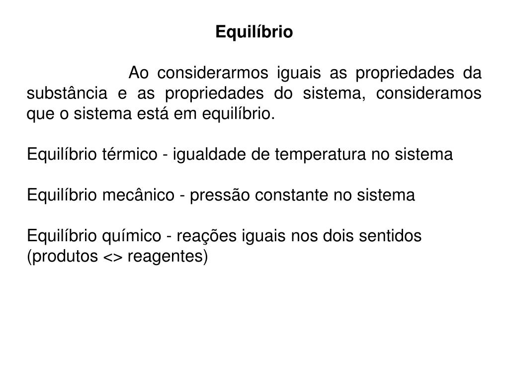 Equilíbrio Ao considerarmos iguais as propriedades da substância e as propriedades do sistema, consideramos que o sistema está em equilíbrio. Equilíbrio térmico - igualdade de temperatura no sistema Equilíbrio mecânico - pressão constante no sistema Equilíbrio químico - reações iguais nos dois sentidos (produtos <> reagentes)