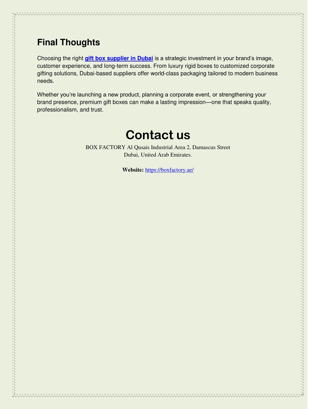 Final Thoughts Choosing the right gift box supplier in Dubaiis a strategic investment in your brand’s image, customer experience, and long-term success. From luxury rigid boxes to customized corporate gifting solutions, Dubai-based suppliers offer world-class packaging tailored to modern business needs. Whether you’re launching a new product, planning a corporate event, or strengthening your brand presence, premium gift boxes can make a lasting impression—one that speaks quality, professionalism, and trust. Contact us BOX FACTORY Al Qusais Industrial Area 2, Damascus Street Dubai, United Arab Emirates. Website: https://boxfactory.ae/
