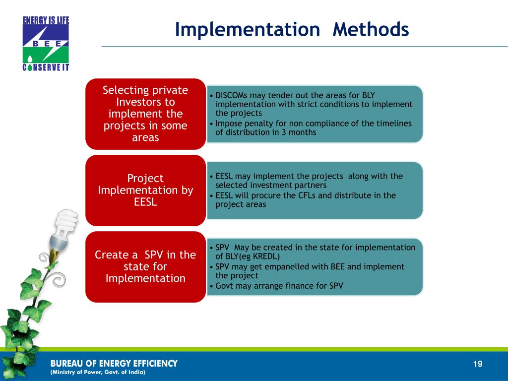 Requirements • The Investor gets empanelled with BEE • DISCOM identifies BEE empanelled Investor • Tri-partite Agreement with DISCOM, Investor and BEE • Investor identifies long-life IS certified CFL supplier • Develop project as per BLY scheme templates