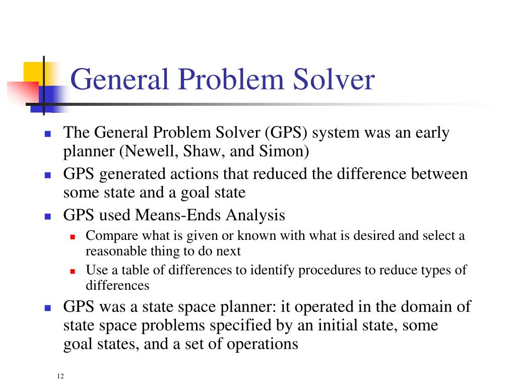 General Problem Solver • The General Problem Solver (GPS) system was an early planner (Newell, Shaw, and Simon) • GPS generated actions that reduced the difference between some state and a goal state • GPS used Means-Ends Analysis • Compare what is given or known with what is desired and select a reasonable thing to do next • Use a table of differences to identify procedures to reduce types of differences • GPS was a state space planner: it operated in the domain of state space problems specified by an initial state, some goal states, and a set of operations