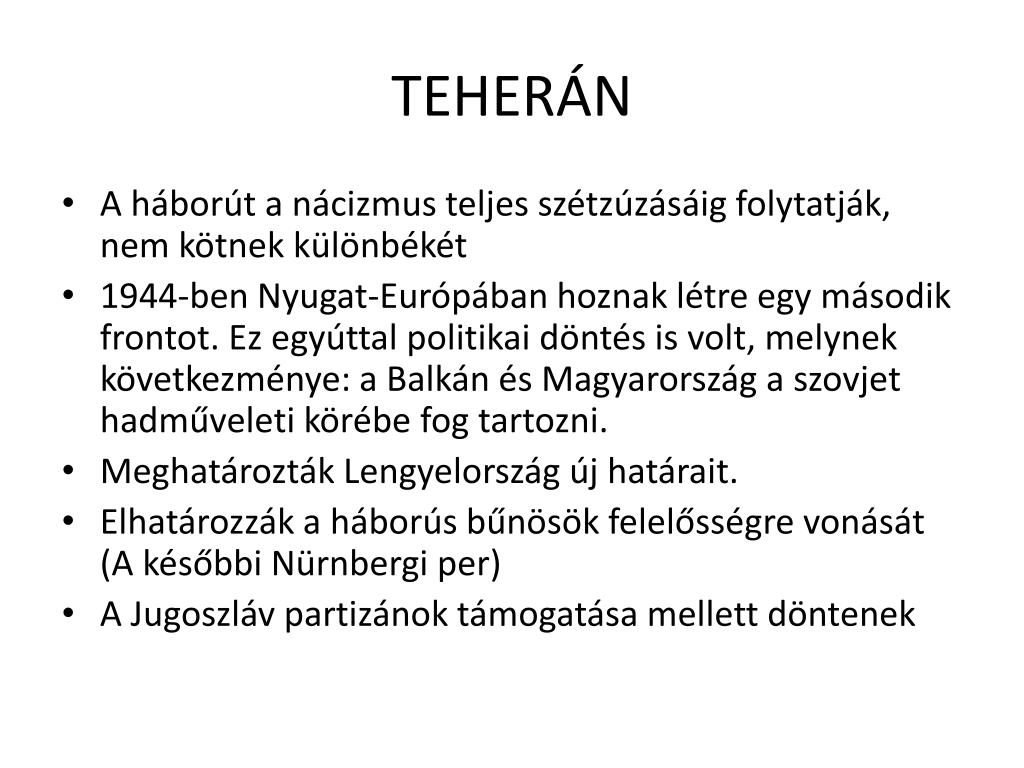 TEHERÁN • A háborút a nácizmus teljes szétzúzásáig folytatják, nem kötnek különbékét • 1944-ben Nyugat-Európában hoznak létre egy második frontot. Ez egyúttal politikai döntés is volt, melynek következménye: a Balkán és Magyarország a szovjet hadműveleti körébe fog tartozni. • Meghatározták Lengyelország új határait. • Elhatározzák a háborús bűnösök felelősségre vonását (A későbbi Nürnbergi per) • A Jugoszláv partizánok támogatása mellett döntenek