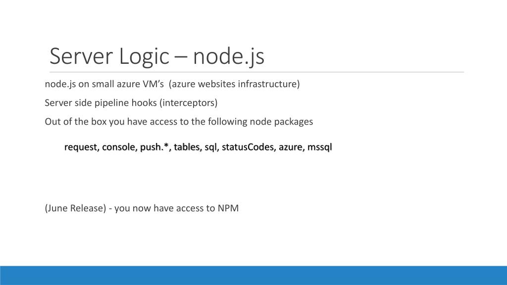 Server Logic – node.js node.js on small azure VM’s (azure websites infrastructure) Server side pipeline hooks (interceptors) Out of the box you have access to the following node packages (June Release) - you now have access to NPM • request, console, push.*, tables, sql, statusCodes, azure, mssql