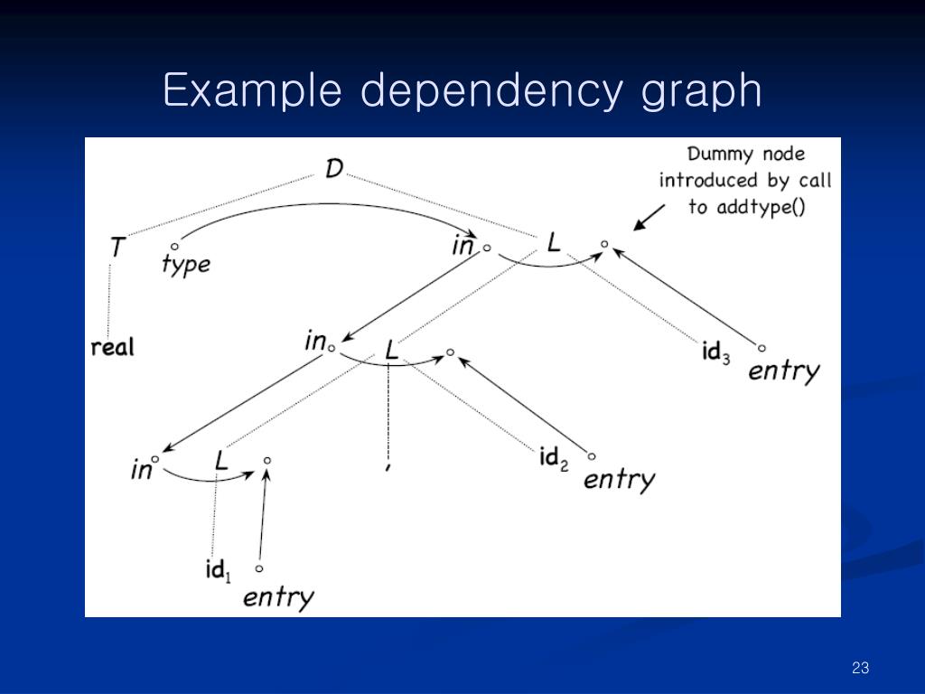 Dependency graphs • If an attribute b depends on attribute c, then attribute b has to be evaluated AFTER c. • DEPENDENCY GRAPHS visualize these requirements. • Each attribute is a node • We add edges from the node for attribute c to the node for attribute b, if b depends on c. • For procedure calls, we introduce a dummy synthesized attribute that depends on the parameters of the procedure calls.