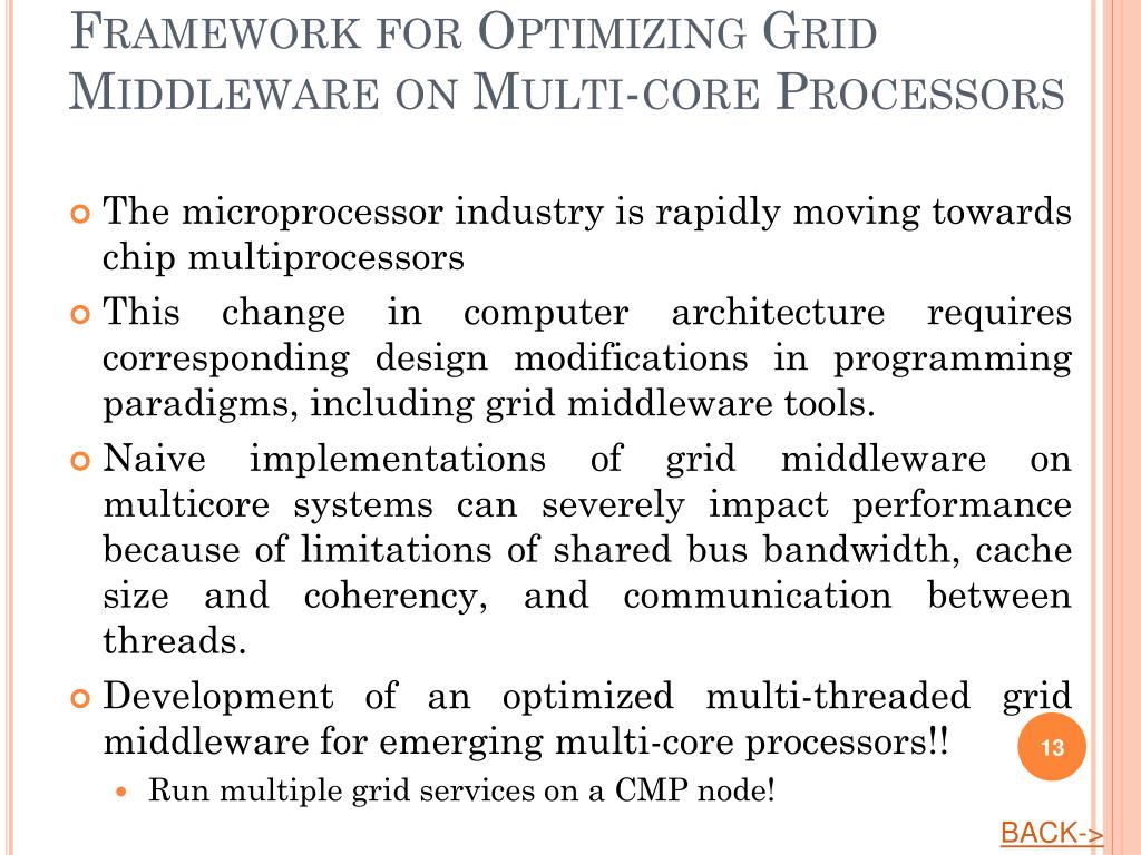 Framework for Optimizing Grid Middleware on Multi-core Processors • The microprocessor industry is rapidly moving towards chip multiprocessors • This change in computer architecture requires corresponding design modifications in programming paradigms, including grid middleware tools. • Naive implementations of grid middleware on multicore systems can severely impact performance because of limitations of shared bus bandwidth, cache size and coherency, and communication between threads. • Development of an optimized multi-threaded grid middleware for emerging multi-core processors!! • Run multiple grid services on a CMP node! BACK->
