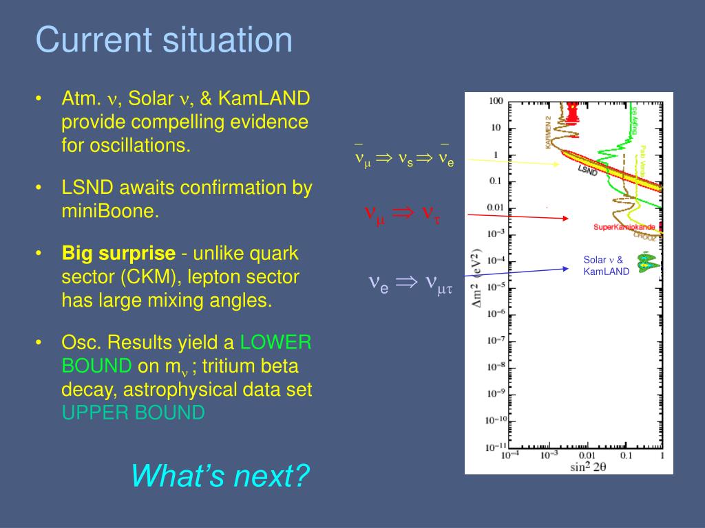 Current situation • Atm. n, Solar n, & KamLAND provide compelling evidence for oscillations. • LSND awaits confirmation by miniBoone. • Big surprise - unlike quark sector (CKM), lepton sector has large mixing angles. • Osc. Results yield a LOWER BOUND on mn ; tritium beta decay, astrophysical data set UPPER BOUND _ _ nmnsne nmnt Solar n & KamLAND nenmt What’s next?