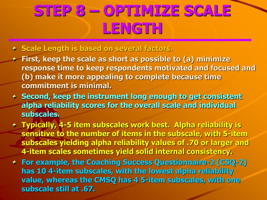 STEP 8 – OPTIMIZE SCALE LENGTH • Scale Length is based on several factors. • First, keep the scale as short as possible to (a) minimize response time to keep respondents motivated and focused and (b) make it more appealing to complete because time commitment is minimal. • Second, keep the instrument long enough to get consistent alpha reliability scores for the overall scale and individual subscales. • Typically, 4-5 item subscales work best. Alpha reliability is sensitive to the number of items in the subscale, with 5-item subscales yielding alpha reliability values of .70 or larger and 4-item scales sometimes yield solid internal consistency. • For example, the Coaching Success Questionnaire-2 (CSQ-2) has 10 4-item subscales, with the lowest alpha reliability value, whereas the CMSQ has 4 5-item subscales, with one subscale still at .67.