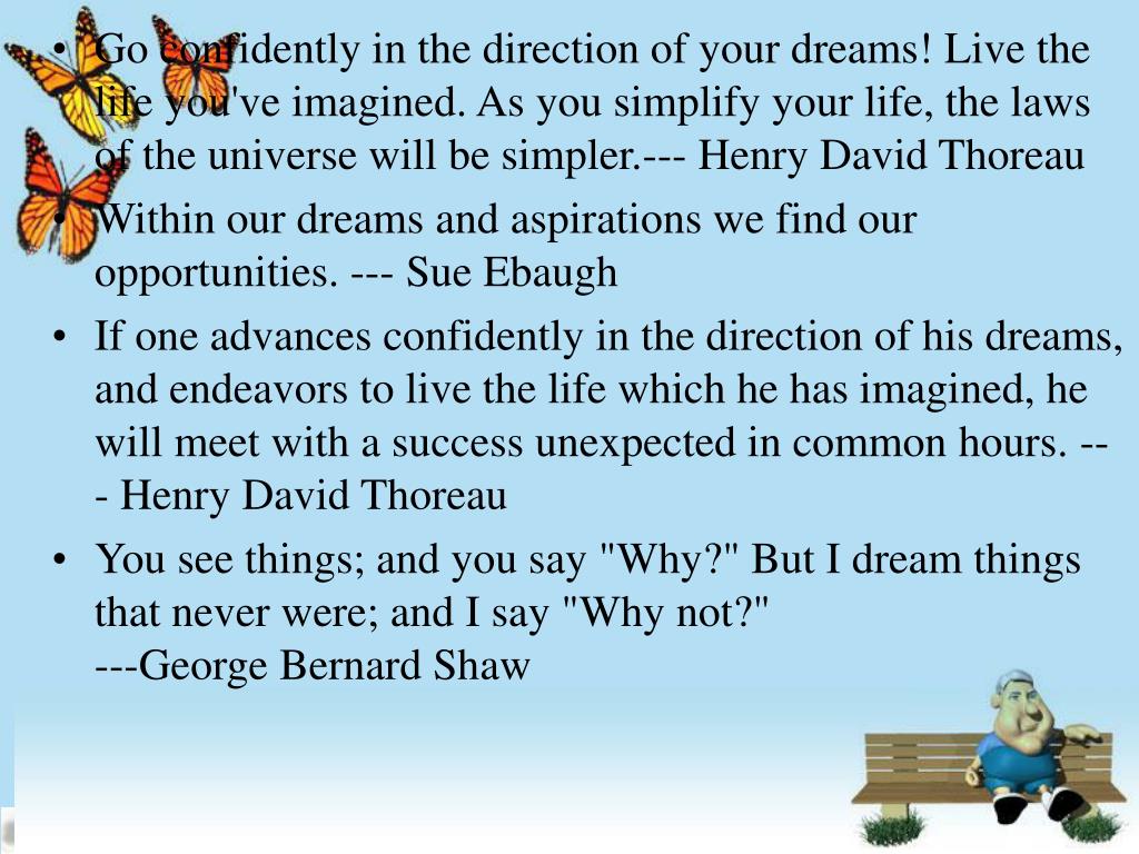 Go confidently in the direction of your dreams! Live the life you've imagined. As you simplify your life, the laws of the universe will be simpler.--- Henry David Thoreau • Within our dreams and aspirations we find our opportunities. --- Sue Ebaugh • If one advances confidently in the direction of his dreams, and endeavors to live the life which he has imagined, he will meet with a success unexpected in common hours. --- Henry David Thoreau • You see things; and you say "Why?" But I dream things that never were; and I say "Why not?" ---George Bernard Shaw