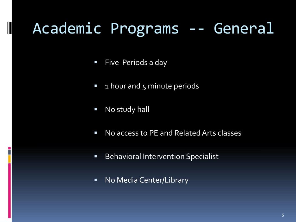 Academic Programs -- General • Five Periods a day • 1 hour and 5 minute periods • No study hall • No access to PEand Related Artsclasses • Behavioral Intervention Specialist • No Media Center/Library