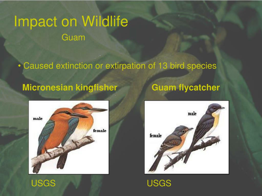 Impact on Wildlife Guam • Caused extinction or extirpation of 13 bird species Micronesian kingfisher Guam flycatcher USGS USGS
