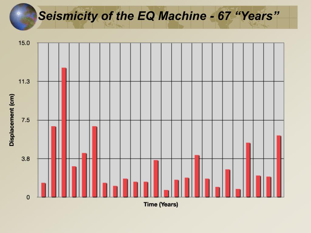 Summary • There are many more small earthquakes than large earthquakes • There are more short time periods between earthquakes than long time periods • In the earthquake machine, the longer since the last earthquake, the larger the earthquake is likely to be • This isn’t usually true in the Earth