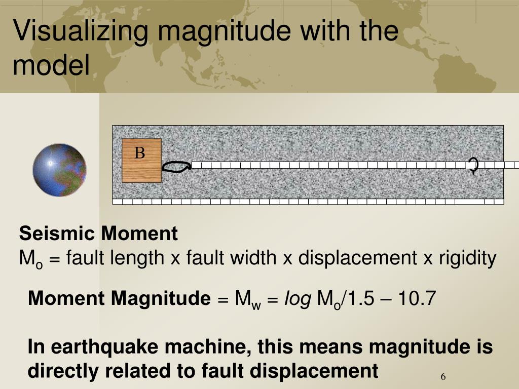 B Visualizing magnitude with the model Seismic Moment Mo = fault length x fault width x displacement x rigidity Moment Magnitude = Mw = log Mo/1.5 – 10.7 In earthquake machine, this means magnitude is directly related to fault displacement 6