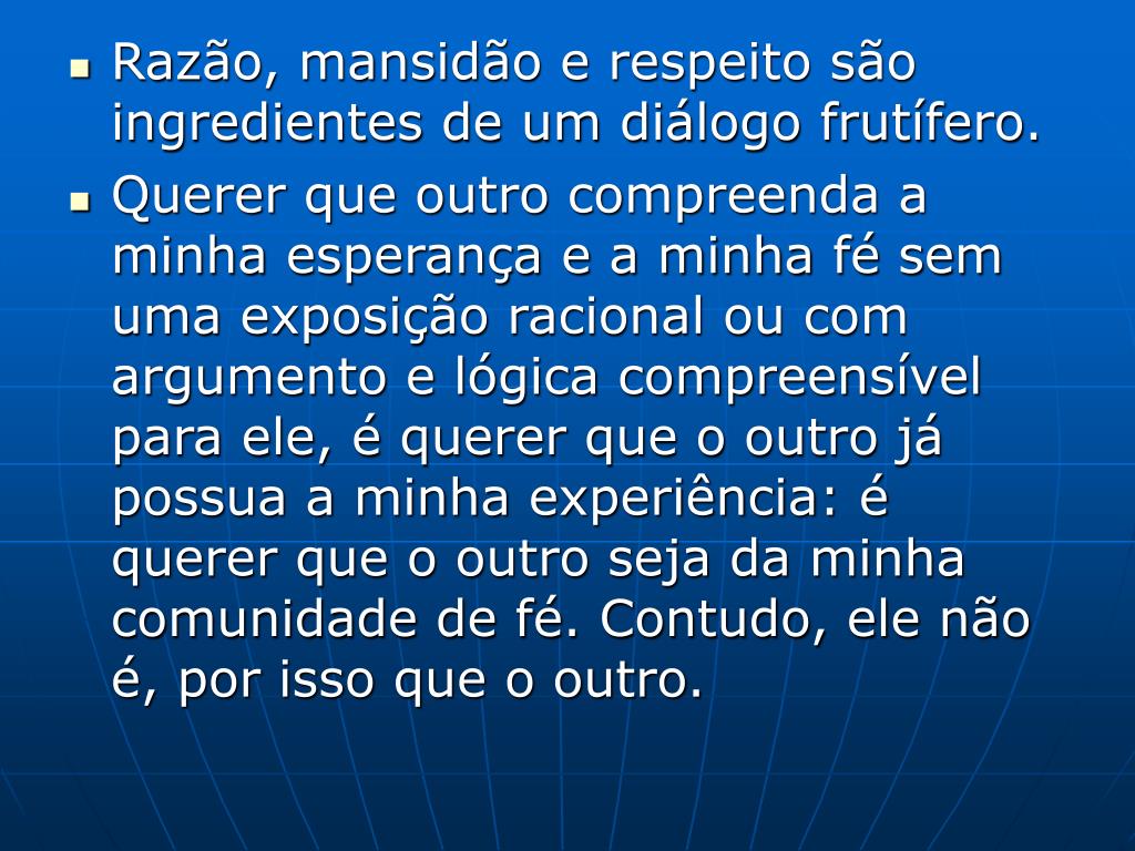 Razão, mansidão e respeito são ingredientes de um diálogo frutífero. • Querer que outro compreenda a minha esperança e a minha fé sem uma exposição racional ou com argumento e lógica compreensível para ele, é querer que o outro já possua a minha experiência: é querer que o outro seja da minha comunidade de fé. Contudo, ele não é, por isso que o outro.