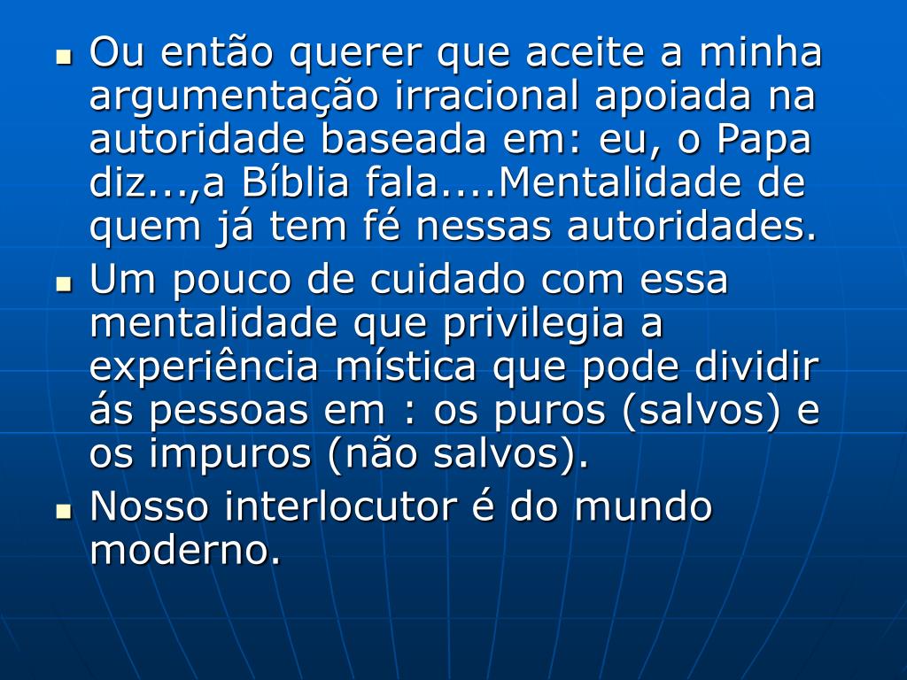 Ou então querer que aceite a minha argumentação irracional apoiada na autoridade baseada em: eu, o Papa diz...,a Bíblia fala....Mentalidade de quem já tem fé nessas autoridades. • Um pouco de cuidado com essa mentalidade que privilegia a experiência mística que pode dividir ás pessoas em : os puros (salvos) e os impuros (não salvos). • Nosso interlocutor é do mundo moderno.