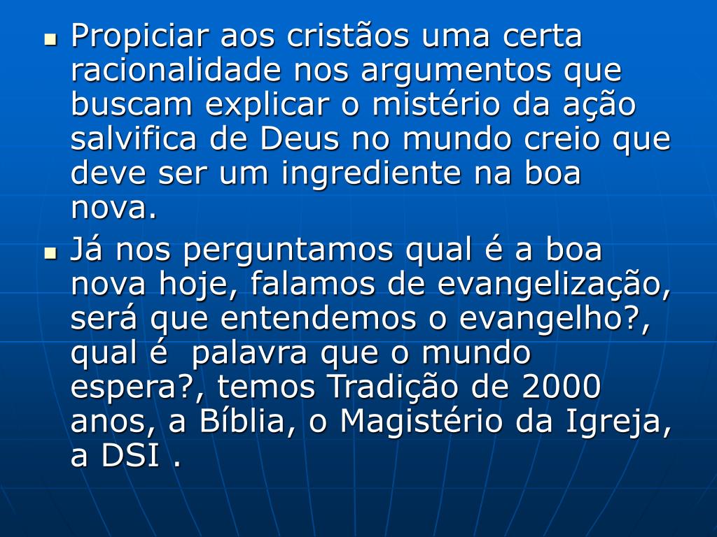 Propiciar aos cristãos uma certa racionalidade nos argumentos que buscam explicar o mistério da ação salvifica de Deus no mundo creio que deve ser um ingrediente na boa nova. • Já nos perguntamos qual é a boa nova hoje, falamos de evangelização, será que entendemos o evangelho?, qual é palavra que o mundo espera?, temos Tradição de 2000 anos, a Bíblia, o Magistério da Igreja, a DSI .