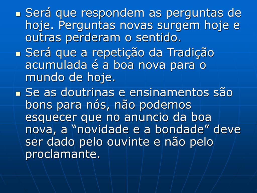 Será que respondem as perguntas de hoje. Perguntas novas surgem hoje e outras perderam o sentido. • Será que a repetição da Tradição acumulada é a boa nova para o mundo de hoje. • Se as doutrinas e ensinamentos são bons para nós, não podemos esquecer que no anuncio da boa nova, a “novidade e a bondade” deve ser dado pelo ouvinte e não pelo proclamante.