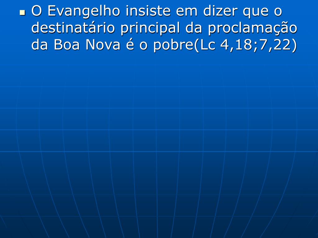 O Evangelho insiste em dizer que o destinatário principal da proclamação da Boa Nova é o pobre(Lc 4,18;7,22)