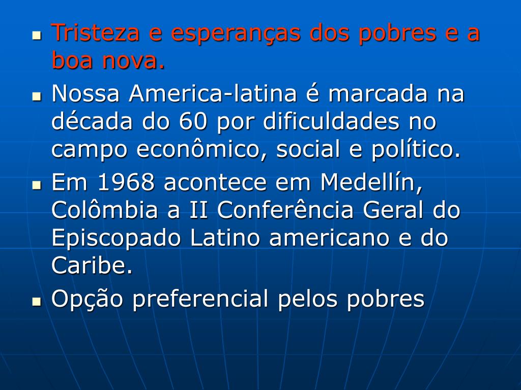 Tristeza e esperanças dos pobres e a boa nova. • Nossa America-latina é marcada na década do 60 por dificuldades no campo econômico, social e político. • Em 1968 acontece em Medellín, Colômbia a II Conferência Geral do Episcopado Latino americano e do Caribe. • Opção preferencial pelos pobres