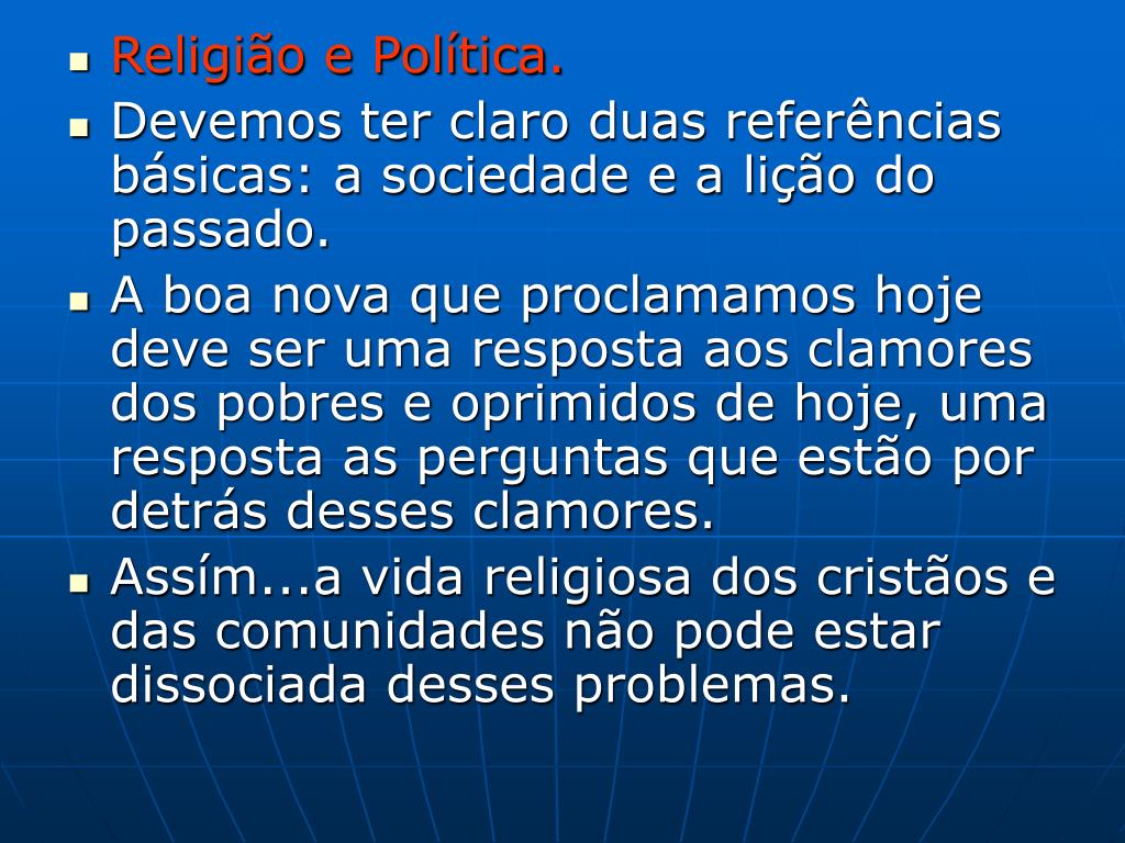 Religião e Política. • Devemos ter claro duas referências básicas: a sociedade e a lição do passado. • A boa nova que proclamamos hoje deve ser uma resposta aos clamores dos pobres e oprimidos de hoje, uma resposta as perguntas que estão por detrás desses clamores. • Assím...a vida religiosa dos cristãos e das comunidades não pode estar dissociada desses problemas.
