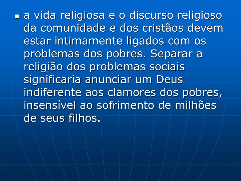 a vida religiosa e o discurso religioso da comunidade e dos cristãos devem estar intimamente ligados com os problemas dos pobres. Separar a religião dos problemas sociais significaria anunciar um Deus indiferente aos clamores dos pobres, insensível ao sofrimento de milhões de seus filhos.