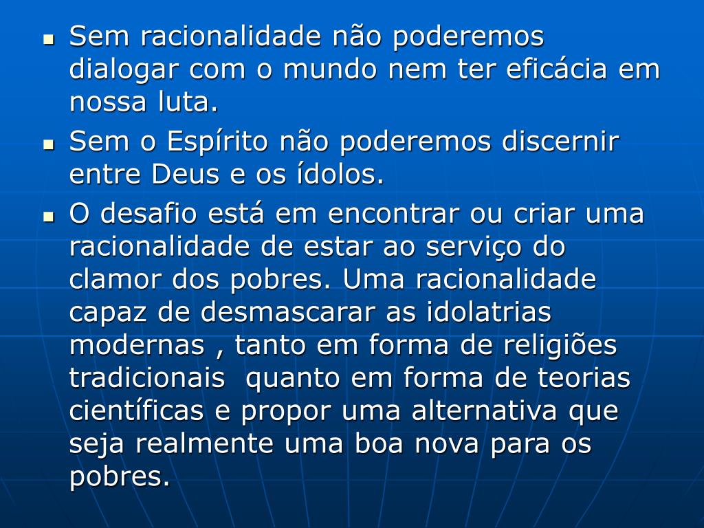 Sem racionalidade não poderemos dialogar com o mundo nem ter eficácia em nossa luta. • Sem o Espírito não poderemos discernir entre Deus e os ídolos. • O desafio está em encontrar ou criar uma racionalidade de estar ao serviço do clamor dos pobres. Uma racionalidade capaz de desmascarar as idolatrias modernas , tanto em forma de religiões tradicionais quanto em forma de teorias científicas e propor uma alternativa que seja realmente uma boa nova para os pobres.