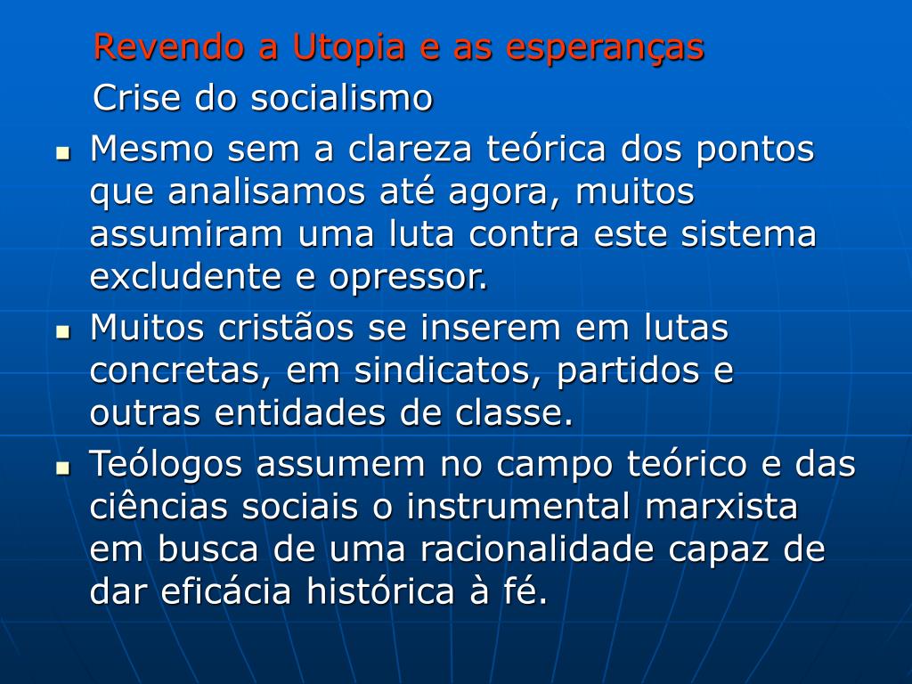 Revendo a Utopia e as esperanças Crise do socialismo • Mesmo sem a clareza teórica dos pontos que analisamos até agora, muitos assumiram uma luta contra este sistema excludente e opressor. • Muitos cristãos se inserem em lutas concretas, em sindicatos, partidos e outras entidades de classe. • Teólogos assumem no campo teórico e das ciências sociais o instrumental marxista em busca de uma racionalidade capaz de dar eficácia histórica à fé.