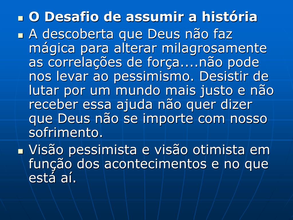 O Desafio de assumir a história • A descoberta que Deus não faz mágica para alterar milagrosamente as correlações de força....não pode nos levar ao pessimismo. Desistir de lutar por um mundo mais justo e não receber essa ajuda não quer dizer que Deus não se importe com nosso sofrimento. • Visão pessimista e visão otimista em função dos acontecimentos e no que está aí.