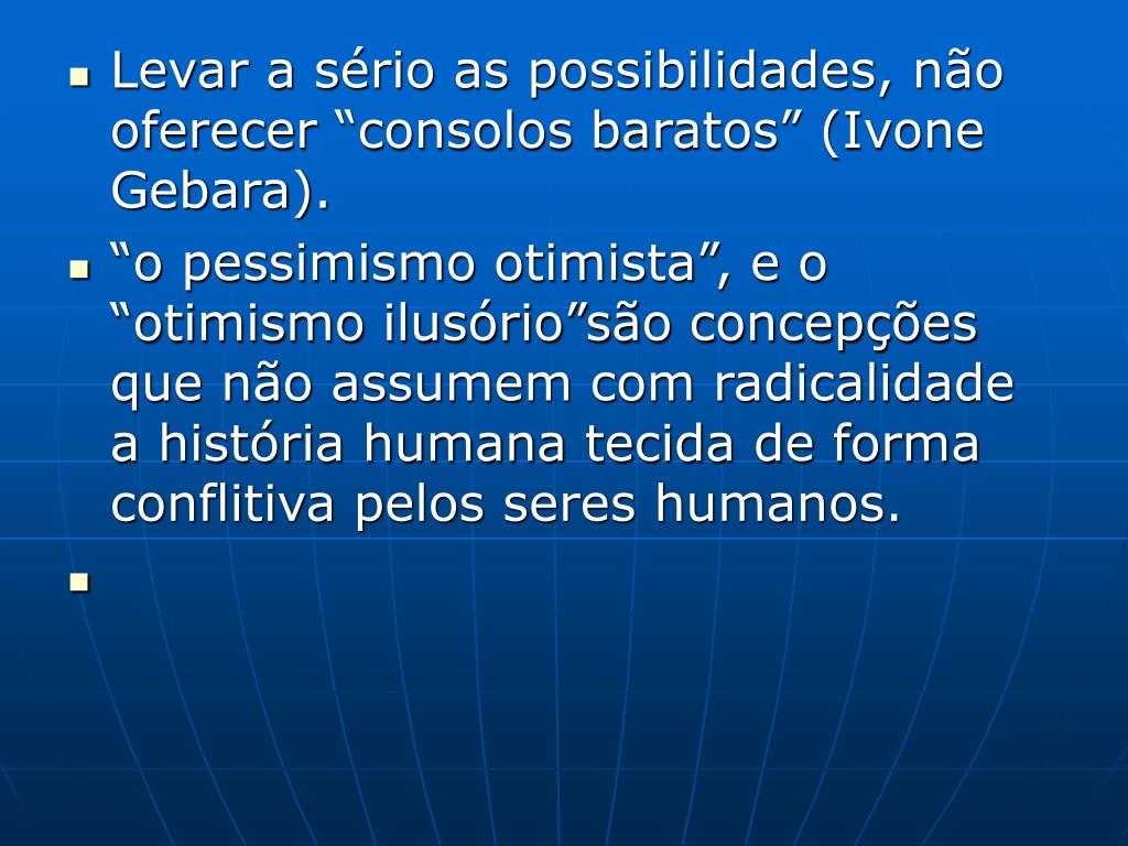 Levar a sério as possibilidades, não oferecer “consolos baratos” (Ivone Gebara). • “o pessimismo otimista”, e o “otimismo ilusório”são concepções que não assumem com radicalidade a história humana tecida de forma conflitiva pelos seres humanos.