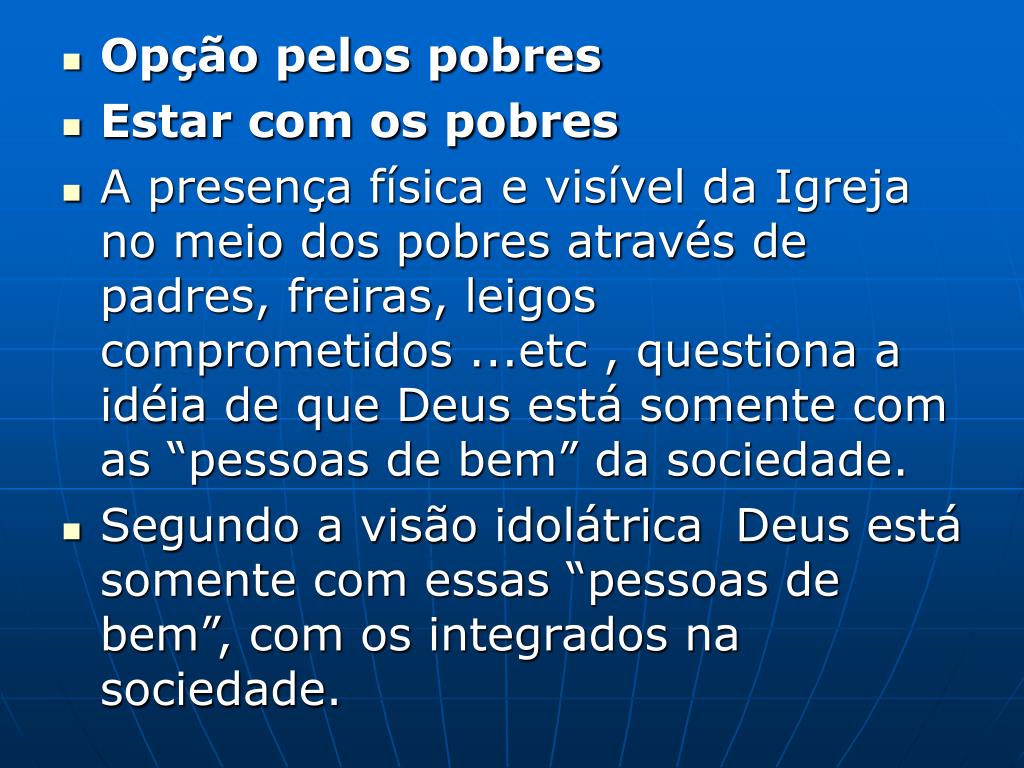 Opção pelos pobres • Estar com os pobres • A presença física e visível da Igreja no meio dos pobres através de padres, freiras, leigos comprometidos ...etc , questiona a idéia de que Deus está somente com as “pessoas de bem” da sociedade. • Segundo a visão idolátrica Deus está somente com essas “pessoas de bem”, com os integrados na sociedade.