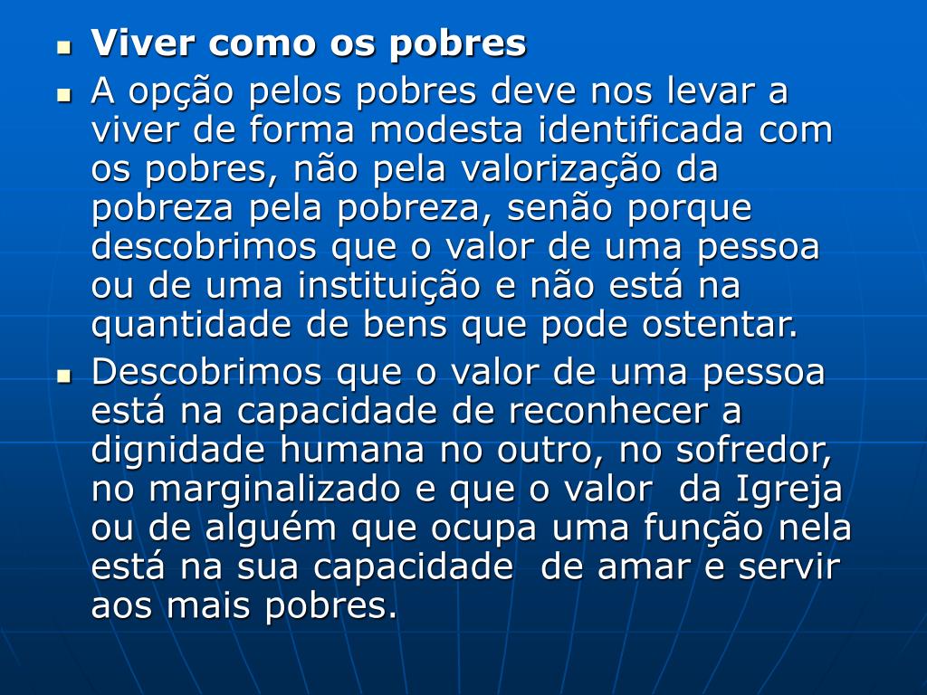 Viver como os pobres • A opção pelos pobres deve nos levar a viver de forma modesta identificada com os pobres, não pela valorização da pobreza pela pobreza, senão porque descobrimos que o valor de uma pessoa ou de uma instituição e não está na quantidade de bens que pode ostentar. • Descobrimos que o valor de uma pessoa está na capacidade de reconhecer a dignidade humana no outro, no sofredor, no marginalizado e que o valor da Igreja ou de alguém que ocupa uma função nela está na sua capacidade de amar e servir aos mais pobres.