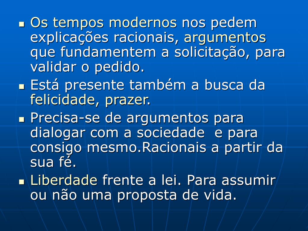 Os tempos modernos nos pedem explicações racionais, argumentos que fundamentem a solicitação, para validar o pedido. • Está presente também a busca da felicidade, prazer. • Precisa-se de argumentos para dialogar com a sociedade e para consigo mesmo.Racionais a partir da sua fé. • Liberdade frente a lei. Para assumir ou não uma proposta de vida.