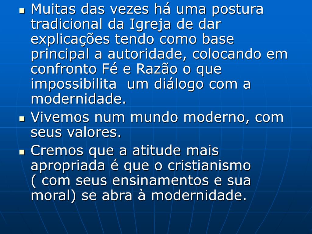 Muitas das vezes há uma postura tradicional da Igreja de dar explicações tendo como base principal a autoridade, colocando em confronto Fé e Razão o que impossibilita um diálogo com a modernidade. • Vivemos num mundo moderno, com seus valores. • Cremos que a atitude mais apropriada é que o cristianismo ( com seus ensinamentos e sua moral) se abra à modernidade.