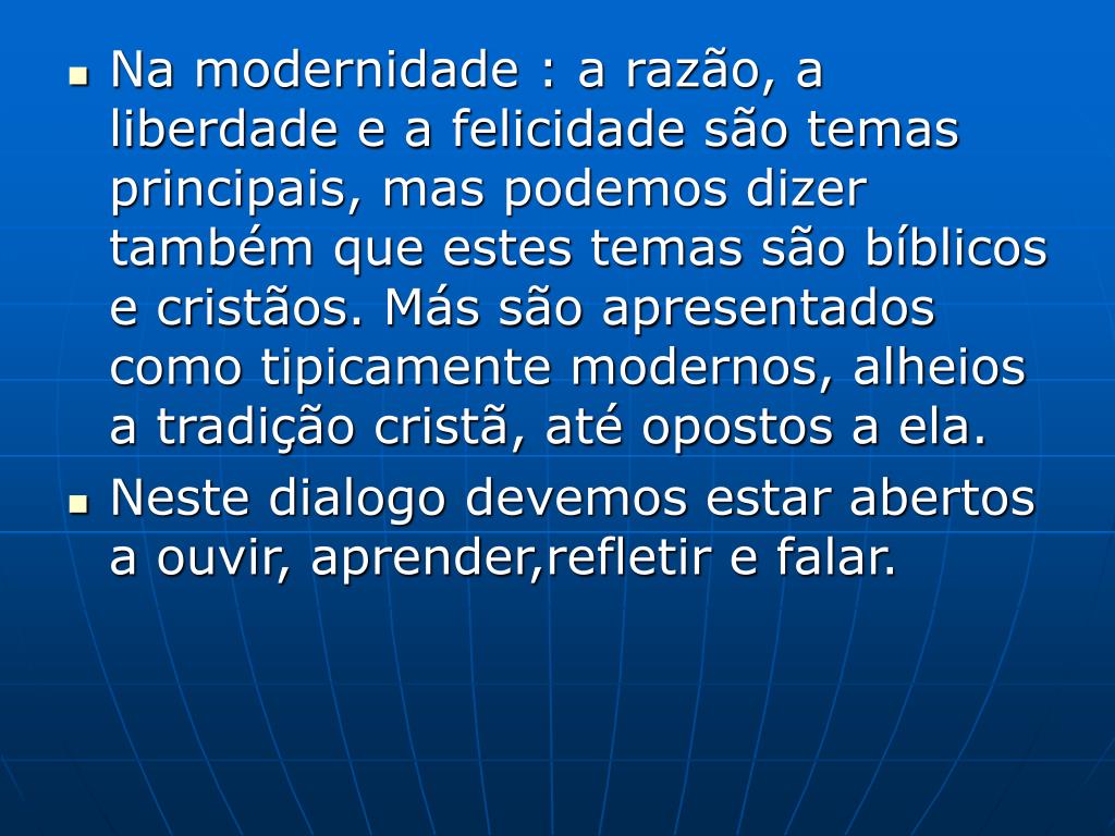 Na modernidade : a razão, a liberdade e a felicidade são temas principais, mas podemos dizer também que estes temas são bíblicos e cristãos. Más são apresentados como tipicamente modernos, alheios a tradição cristã, até opostos a ela. • Neste dialogo devemos estar abertos a ouvir, aprender,refletir e falar.