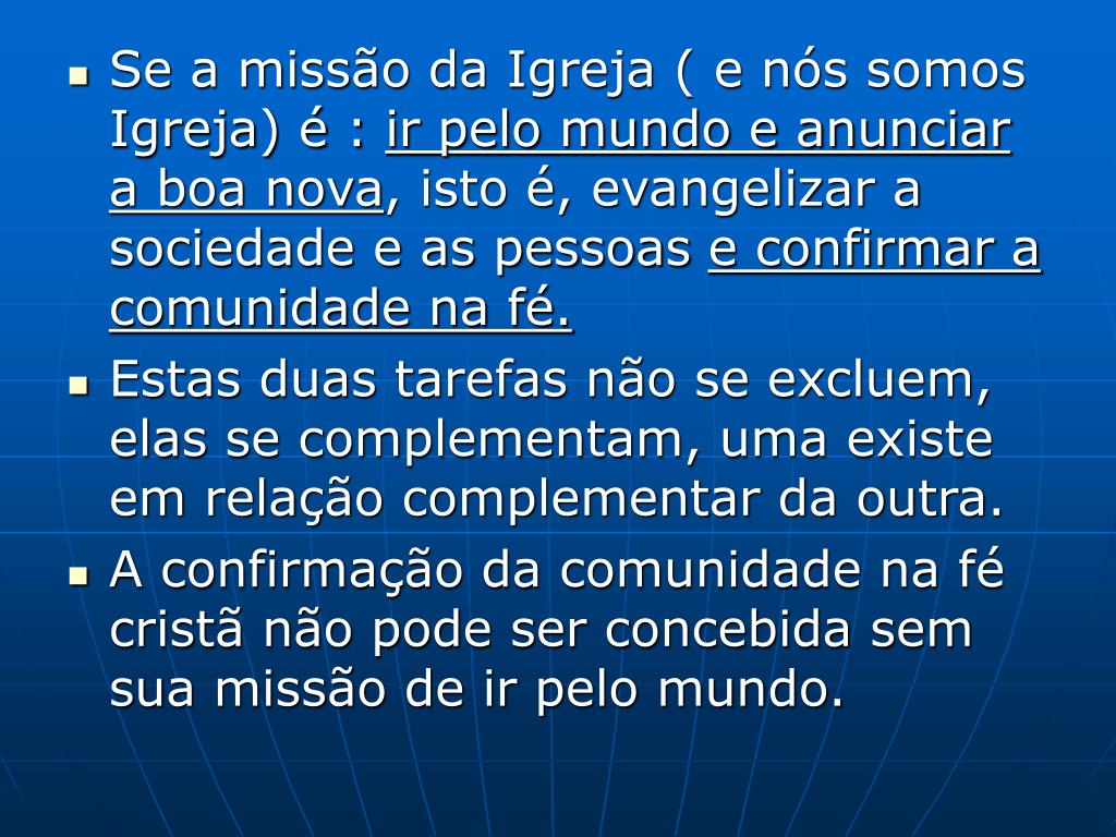 Se a missão da Igreja ( e nós somos Igreja) é : ir pelo mundo e anunciar a boa nova, isto é, evangelizar a sociedade e as pessoas e confirmar a comunidade na fé. • Estas duas tarefas não se excluem, elas se complementam, uma existe em relação complementar da outra. • A confirmação da comunidade na fé cristã não pode ser concebida sem sua missão de ir pelo mundo.
