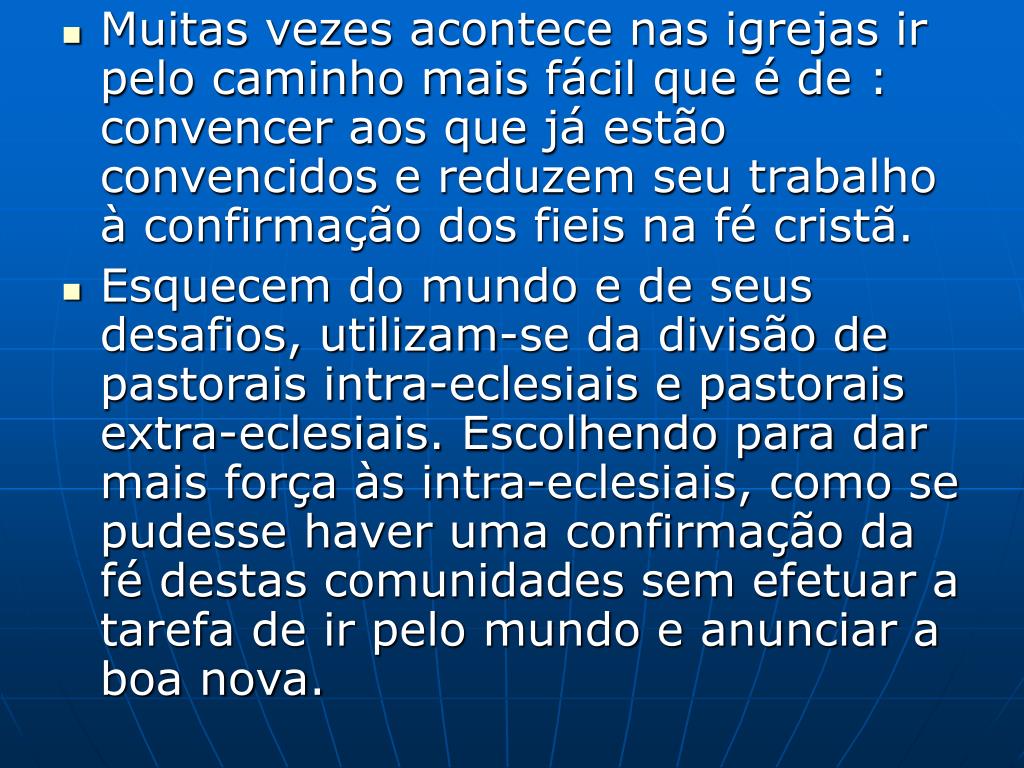 Muitas vezes acontece nas igrejas ir pelo caminho mais fácil que é de : convencer aos que já estão convencidos e reduzem seu trabalho à confirmação dos fieis na fé cristã. • Esquecem do mundo e de seus desafios, utilizam-se da divisão de pastorais intra-eclesiais e pastorais extra-eclesiais. Escolhendo para dar mais força às intra-eclesiais, como se pudesse haver uma confirmação da fé destas comunidades sem efetuar a tarefa de ir pelo mundo e anunciar a boa nova.