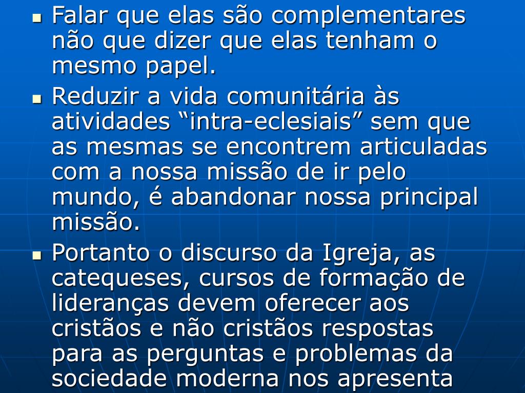 Falar que elas são complementares não que dizer que elas tenham o mesmo papel. • Reduzir a vida comunitária às atividades “intra-eclesiais” sem que as mesmas se encontrem articuladas com a nossa missão de ir pelo mundo, é abandonar nossa principal missão. • Portanto o discurso da Igreja, as catequeses, cursos de formação de lideranças devem oferecer aos cristãos e não cristãos respostas para as perguntas e problemas da sociedade moderna nos apresenta
